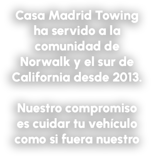 EXCELLENT Based on 17 reviews Posted on Dominique CornejoTrustindex verifies that the original source of the review is Google. I needed to get a tow after my car had engine trouble and wasn’t running right. I have a lowered car, and so I was quoted outrageous prices or turned away from every tow company in the area and contracted through AAA, but the wonderful Jesus from Casa Madrid Towing saved me! He assured me that he would be able to handle towing my lowered car and provided me with a great rate. He was on time, had good communication before arriving, and was very friendly and helpful when he did arrive. Jesus treated me and my family with respect and kindness, and made sure my car didn’t get damaged at all. Jesus and Casa Madrid Towing are the best!Posted on Anthony ConsuelosTrustindex verifies that the original source of the review is Google. What can I say I truly appreciate his service dearly I was stuck far away from home and he offered me a great price to get my car back home I thank him very much for his help and service I recommend him 100% great guy thanks again I appreciate itPosted on Tee JayyyTrustindex verifies that the original source of the review is Google. Jesus was really nice and helpful.Posted on Nathan HeibeckTrustindex verifies that the original source of the review is Google. Super nice guy, fair pricing, excellent service!Posted on Zetha SovyanhadiTrustindex verifies that the original source of the review is Google. Jesus was super friendly, on time. moved my lower car professionally and quickly!Posted on Ricky CTrustindex verifies that the original source of the review is Google. Called around 830pm and got and estimate and schedule a tow Driver arrived quick and was super helpful Even helped us manually push the truck to get it out of the sidewalk Awesome service Will definitely use again if neededPosted on GIO AYALATrustindex verifies that the original source of the review is Google. Fast and reliable. I called two companies at the same time. But this was the fastest and on time. The driver was friendly and super helpful. Had a great experience.Posted on Marce BasilioTrustindex verifies that the original source of the review is Google. Exelente servicio y muy amable se los recomiendo al 100%Posted on Studio 3dTrustindex verifies that the original source of the review is Google. Quick easyPosted on Team SamirahTrustindex verifies that the original source of the review is Google. So, my friend's car broke down in a parking lot in Santa Fe Springs last night. On top of that, it was raining outside.. I was no where near that town. I looked up Casa Madrid and when I called, they offered to tow her to her car for a great rate, the best rate I had heard after calling 5 other towing companies in Southern California. The driver showed up within 20 minutes and gave her courteous service towing her car back to her home. We were so relieved. I wish there was a way we could give them 10 stars. They made sure my friend and her car were transported from a parking lot in the rain to back home safe and sound for a terrific rate.Verified by TrustindexTrustindex verified badge is the Universal Symbol of Trust. Only the greatest companies can get the verified badge who has a review score above 4.5, based on customer reviews over the past 12 months. Read more